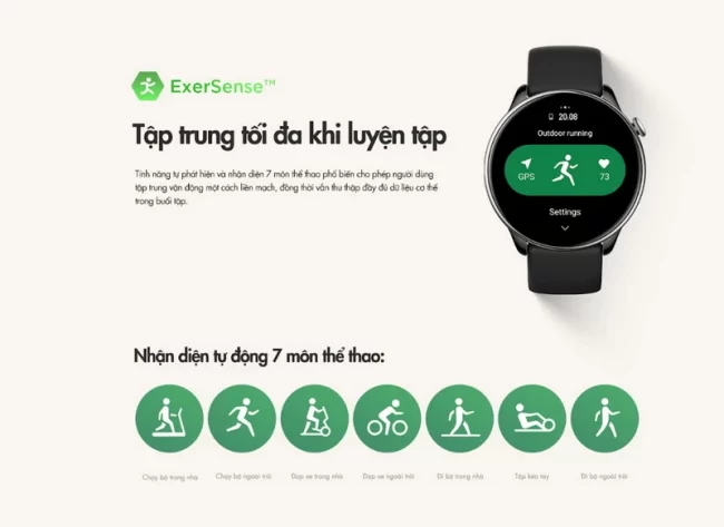 Ra đời với mục đích đồng hành cùng những bạn trẻ yêu thể thao, Amazfit GTR Mini được trang bị nhiều tính năng hỗ trợ người dùng xây dựng lối sống lành mạnh. Sản phẩm sở hữu tính năng tự phát hiện 7 môn thể thao phổ biến và hỗ trợ 120 chế độ tập luyện khác. Người dùng chỉ cần tập trung vận động liền mạch, hệ thống sẽ tự động thu thập đầy đủ dữ liệu cơ thể trong buổi tập. Bên cạnh đó, với khả năng chịu áp lực nước 5 ATM, người dung có thể đeo đồng hồ thoải mái đi dưới trời mưa, đi bơi mà không lo hư hỏng.