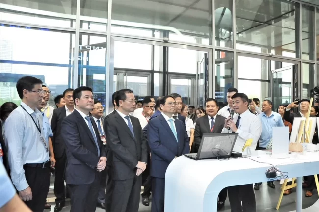 Thủ tướng Chính phủ Phạm Minh Chính (thứ 4 hàng trước, từ trái qua) và lãnh đạo các bộ, ngành tham quan khu vực trình diễn các giải pháp số của VNPT tại Industry 4.0 Summit 2023.