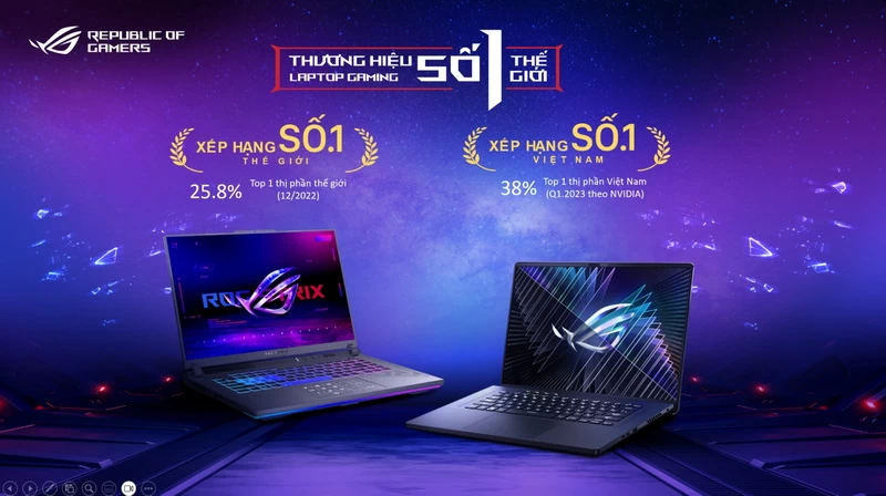 Là thương hiệu gaming số 1 thế giới và số 1 Việt Nam (với 38% thị phần trong Q1-2023, theo số liệu của NVIDIA), ROG (Republic of Gamers) đã tiếp tục làm choáng ngợp cả thị trường với loạt sản phẩm hoàn toàn mới sử dụng những linh kiện mới nhất từ Intel, AMD và NVIDIA, đồng thời phổ cập công nghệ tản nhiệt 3 quạt thông minh, cùng màn hình tiêu chuẩn 16:10 với tần số quét lên đến 240Hz và độ phủ màu cực cao 100% DCI-P3, mang tới nhiều giá trị vượt trội cho game thủ Việt Nam.