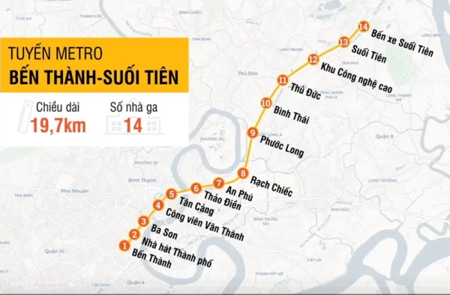 Khởi công xây dựng vào tháng 8-2012, tuyến metro số 1 TP.HCM dài 19,7km với 14 ga (gồm 3 ga ngầm và 11 ga trên cao), có tổng mức đầu tư hơn 43.700 tỷ đồng. Tuyến dự kiến vận hành từ cuối quý 4-2023.