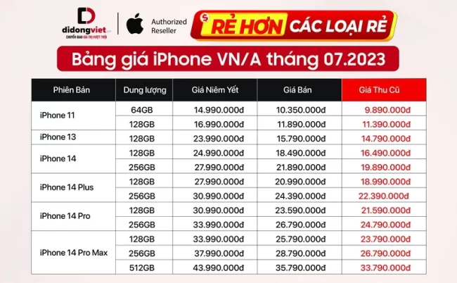 Bảng giá iPhone VN/A tại Di Động Việt tháng 7–2023.