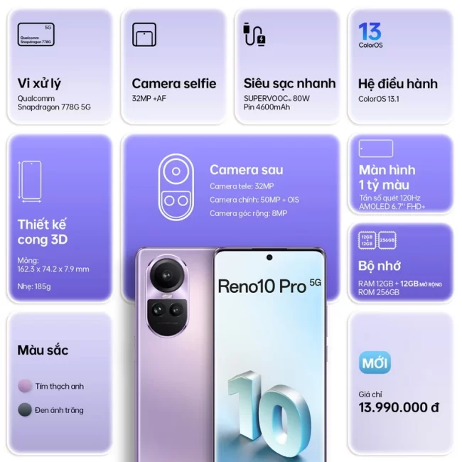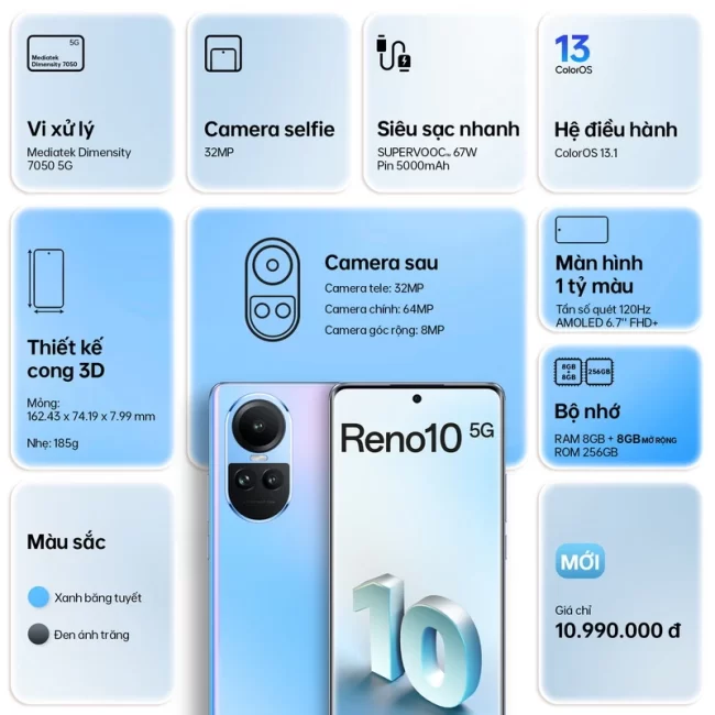 - Reno10 5G (RAM 8GB + ROM 256GB): 10.990.000 đồng, được bán tại tất cả các hệ thống bán lẻ trên toàn quốc.