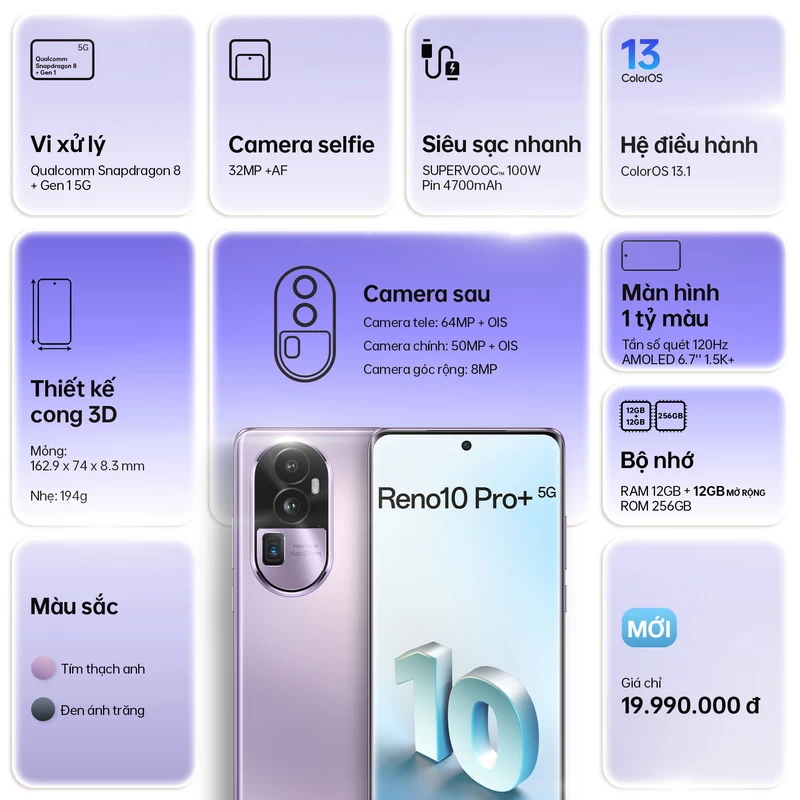 - Reno10 Pro+ 5G sẽ được mở bán trong tháng 9-2023. Giá dự kiến 19.990.000 đồng.