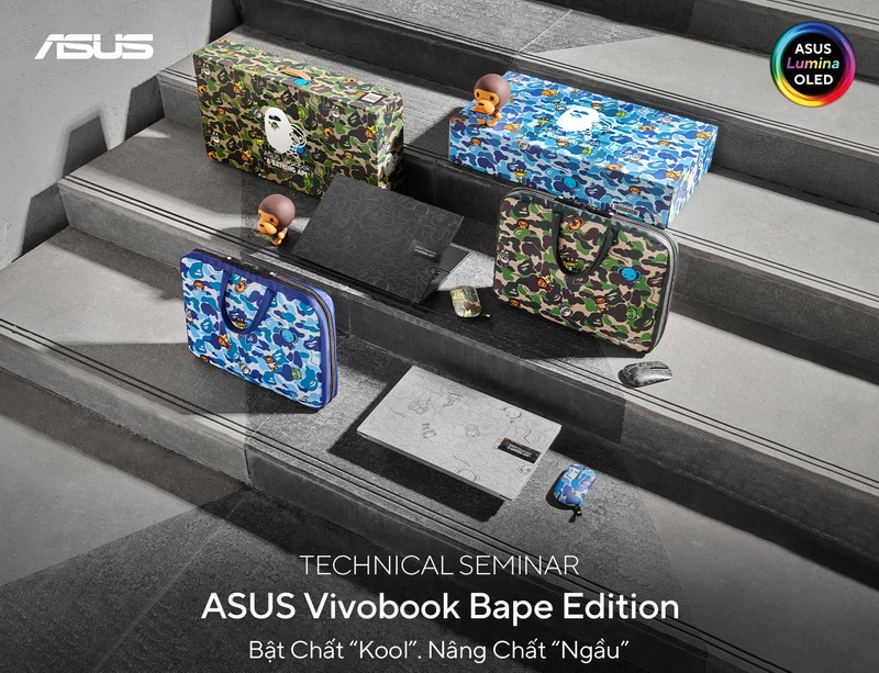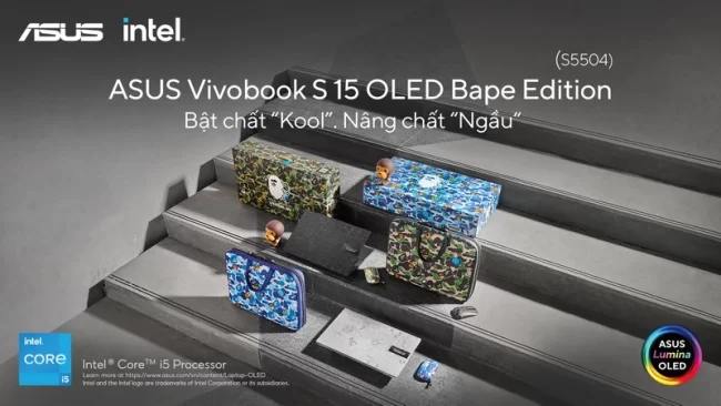 ASUS Việt Nam ngày 23-8-2023 đã giới thiệu bộ siêu tập laptop Vivobook S 15 OLED BAPE Edition – dòng sản phẩm đầu tiên với hoạt tiết BAPE camo độc quyền, hợp tác với thương hiệu thời trang đường phố streetwear nổi tiếng từ Nhật Bản – A BATHING APE (BAPE).
