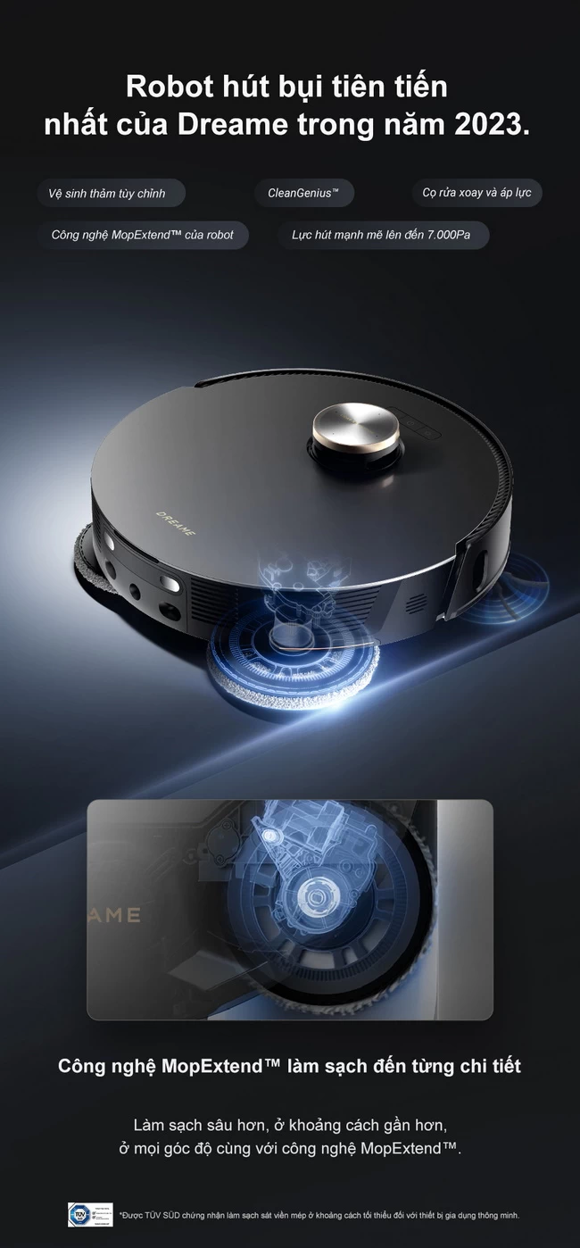 Công nghệ MopExtend hoàn toàn mới, được Dreame phát triển và ứng dụng trên thế giới. Cụ thể, nhờ cảm biến được trang bị sẵn, robot sẽ nhận diện được cạnh tủ, góc nhà và các mép tường, sau đó tự động xòe giẻ lau ra để vệ sinh sát những khu vực đó. Nhờ khả năng quạt giẻ lau sát cạnh 2mm, thiết bị sẽ làm sạch được các vết bẩn, bụi, tóc… ở những vị trí khó tiếp cận, giống hệt cách con người lau dọn thủ công.