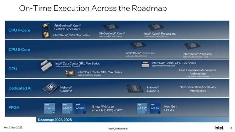 Intel cho biết: Lộ trình và các sản phẩm dành cho trung tâm dữ liệu của Intel đang đi theo đúng kế hoạch đã vạch ra để có thể cung cấp cho khách hàng đúng hạn. Các vi xử lý Intel Xeon thế hệ 5 (tên mã Emerald Rapids) đang được cung cấp mẫu cho các khách hàng và dự kiến sẽ ra mắt đúng hẹn vào quý 4-2023. Các vi xử lý Intel Xeon với nhân E-core (Sierra Forest) dự kiến sẽ đến tay doanh nghiệp trong nửa đầu năm 2024. Các vi xử lý Intel Xeon với nhân P-core (Granite Rapids) cũng sẽ ra mắt một thời gian ngắn sau đó. Các mạch tích hợp Intel Agilex 9 Direct RF FPGA đã được chuyển đến các hệ thống của BAE trước 6 quý so với kế hoạch đã đề ra. Điều này cho thấy khả năng của Intel trong việc cung ứng các tính năng đầu ngành nhanh chóng thông qua việc tích hợp không đồng nhất dựa trên mạch chiplet (chiplet-based heterogeneous integration) với công nghệ cầu liên kết đa die tích hợp (embedded multi-die interconnect bridge, EMIB) của Intel.