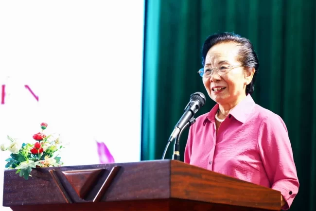 Giáo sư, Tiến sĩ Nguyễn Thị Doan – Nguyên Phó Chủ tịch nước, Chủ tịch Hội Khuyến học Việt Nam, phát biểu tại buổi lễ trao học bổng ở Hà Nam ngày 26-8-2023.