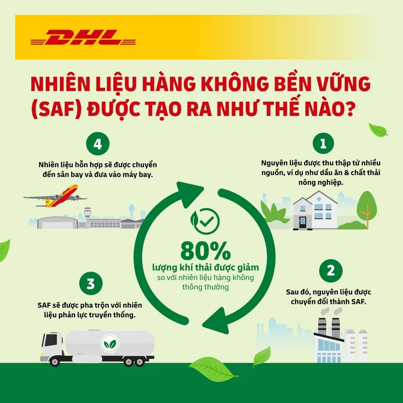 Tập đoàn DHL cam kết đạt mức phát thải ròng bằng 0 vào năm 2050 và đang đầu tư 7 tỷ euro vào các sáng kiến giảm phát thải carbon cho đến năm 2030. Với khoảng 90% lượng khí thải carbon có nguồn gốc từ mạng lưới hàng không, các giải pháp vận tải hàng không khả thi và bền vững rất quan trọng để tạo nên hoạt động logistics xanh và sạch hơn. Trong các giải pháp đó, có hai trong số những thỏa thuận lớn nhất từ trước đến nay của DHL với bp và Neste – hai đơn vị này sẽ cung cấp cho DHL hơn 800 triệu lít SAF cho đến năm 2026. Việc này sẽ góp phần vào mục tiêu tạm thời là sử dụng 30% SAF cho mọi phương tiện vận tải hàng không vào năm 2030. Tương tự, DHL Express cũng đã hợp tác với Eviation và sẽ nhận 12 máy bay chở hàng hoạt động bằng điện năng từ năm 2027 trở đi.
