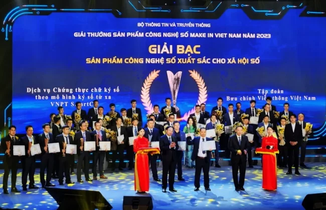 Tại Lễ công bố và trao Giải thưởng Sản phẩm Công nghệ số Make in Vietnam 2023 vừa được Bộ Thông tin và Truyền thông tổ chức sáng 11-12-2023 tại Quảng Ninh, Tập đoàn Bưu chính – Viễn thông Việt Nam VNPT đã có 6 sản phẩm số được vinh danh trong Top 10 ở 3 hạng mục của giải thưởng, đặc biệt trong đó có 1 giải Bạc và 1 giải Đồng. Lễ trao giải này diễn ra trong khuôn khổ Diễn đàn Quốc gia Phát triển doanh nghiệp Công nghệ số Việt Nam lần thứ 5 VFTE 2023.