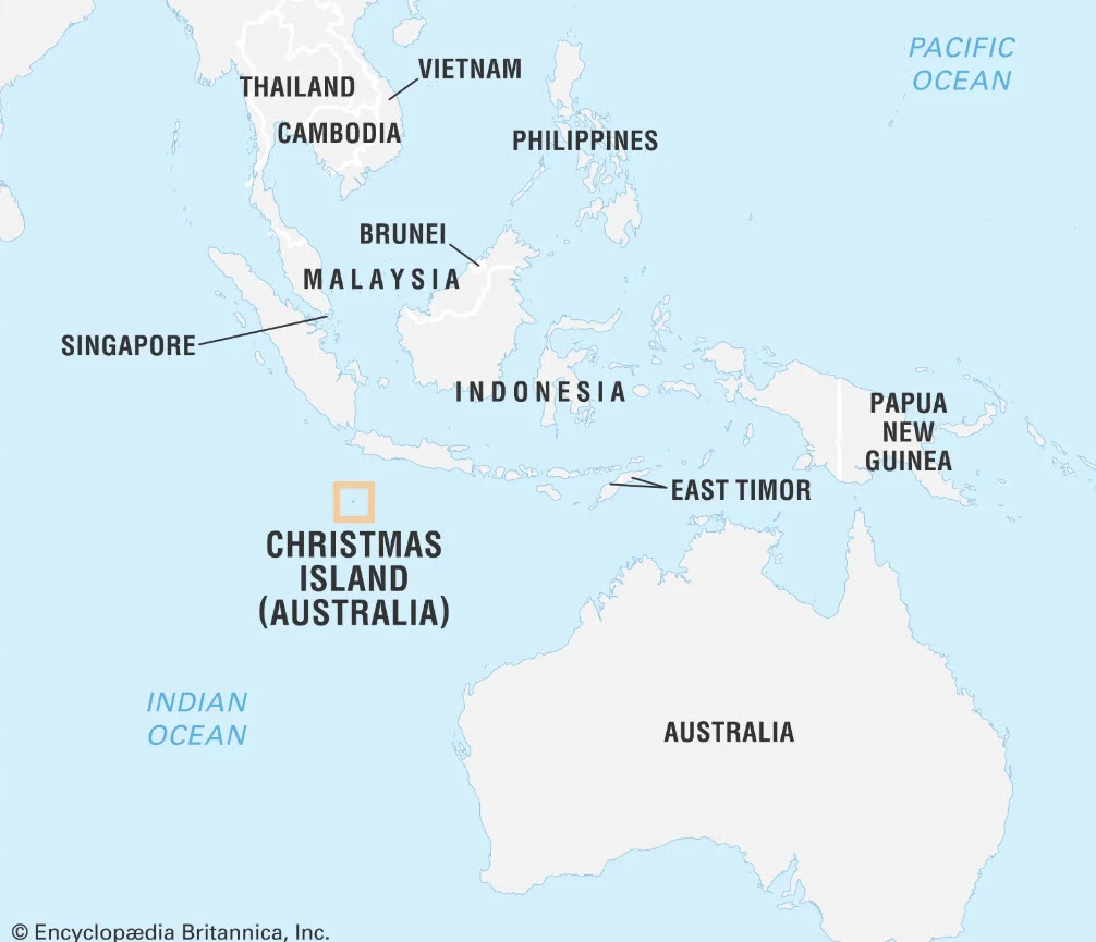 - Christmas Island (Kiritimati) là một lãnh thổ của Úc ở Ấn Độ Dương, nằm ở phía Nam đảo Java (Indonesia). Ngày 1-10-1958, lãnh thổ này được chuyển từ Singapore sang Úc. Đảo 135 km vuông này hiện chỉ có khoảng 2.000 dân. Múi giờ UTC+07.