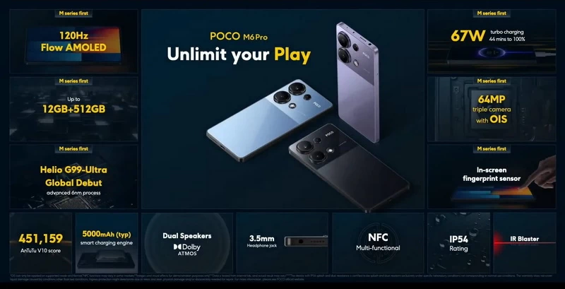 POCO M6 Pro hứa hẹn mang đến trải nghiệm mượt mà với chip MediaTek Helio G99-Ultra, màn hình AMOLED 120Hz, cùng cụm 3 camera 64MP được tích hợp tính năng chống rung quang học OIS, sạc nhanh 67W. POCO M6 Pro có thể xem là chiếc smartphone giá mềm đáng cân nhắc, đặc biệt là với các game thủ hạn chế về ngân sách, nhưng vẫn muốn chinh phục các tựa game mới nhất.