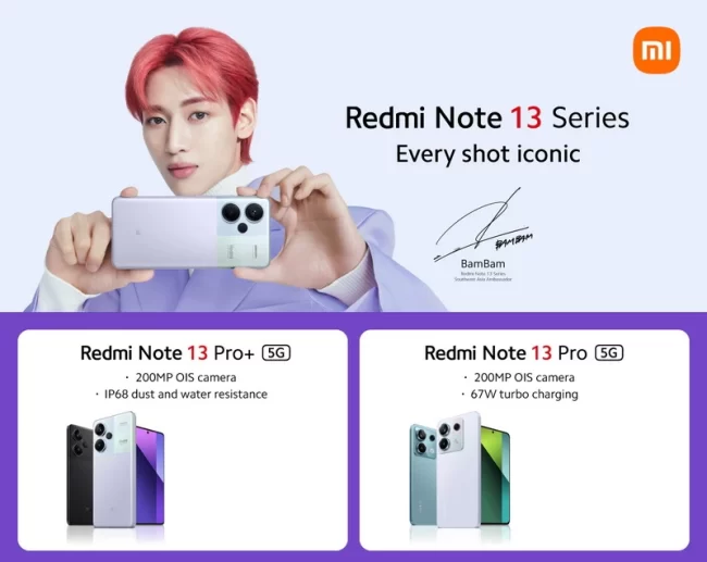 Thương hiệu công nghệ Xiaomi vào lúc 17g chiều 15-1-2024 đã ra mắt dòng sản phẩm Redmi Note 13 Series trong sự kiện “Every Shot Iconic” diễn ra tại Bangkok (Thái Lan) cùng một lúc với sự kiện “Trọn Nét Độc Bản” tại TP.HCM (Việt Nam). Dòng Redmi Note 13 Series chào sân với 3 phiên bản Redmi Note 13, Redmi Note 13 Pro 5G và Redmi Note 13 Pro+ 5G có camera lên tới 200MP / lossless in-sensor zoom 4x (ở Redmi Note 13 Pro 5G và Redmi Note 13 Pro+ 5G) và 108MP / lossless in-sensor zoom 3x (ở Redmi Note 13). BamBam (nam ca sĩ Thái Lan là thành viên nhóm nhạc nam đa quốc tịch GOT7 của Hàn Quốc) là đại sứ đầu tiên của Xiaomi Đông Nam Á đại diện cho dòng Redmi Note 13 Series tại khu vực.