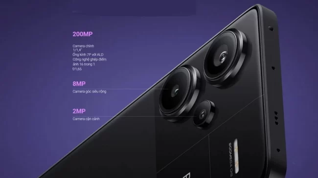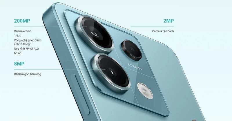 Ở phân khúc thị trường tầm trung, Redmi Note 13 Pro 5G là chiếc smartphone hiếm hoi mang đến trải nghiệm nhiếp ảnh chuyên nghiệp khi được trang bị camera độ phân giải cực cao lên đến 200MP (f/1.65); kích thước cảm biến 1/1.4”; ống kính 7P; công nghệ ghép điểm ảnh pixel-binning 16-in-1 thành một điểm ảnh lớn 2.24μm; cùng công nghệ chống rung quang học OIS. Đáng chú ý, người dùng còn có thể lấy nét những vật thể ở khoảng cách rất xa với zoom ngay trong cảm biến in-sensor zoom 4x không mất dữ liệu cho phép thu phóng 2x, 4x mà ảnh chụp vẫn giữ được nét và chất lượng cao. Camera góc siêu rộng 8MP và camera macro 2MP. Camera trước 16MP. Công nghệ ổn định kép OIS+EIS giúp chống rung hiệu quả hơn hẳn. Tính năng ổn định hình ảnh quang học (OIS) giúp làm cân bằng vấn đề rung tay và chuyển động của máy ảnh. Kết hợp với EIS (Ổn định hình ảnh điện tử), tính năng này hoạt động giống như một chân máy vô hình để bạn có thể chụp ảnh và quay video rõ ràng hơn.