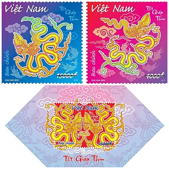 Bộ tem bưu chính “Tết Giáp Thìn” gồm 2 mẫu tem khuôn khổ 37 x 37mm và 1 blốc tem kích thước 80 x 80mm, do họa sĩ Nguyễn Quang Vinh, Tổng Công ty Bưu điện Việt Nam, thiết kế. Bô tem được Công ty Tem Việt Nam phát hành ngày 24-12-2023 với giá mặt là 4.000đ, 15.000đ và 15.000đ.