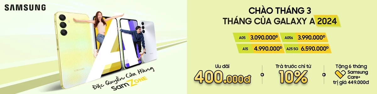 Trong chương trình khuyến mại “Tháng 3 – Tháng của Galaxy A 2024″, từ giờ đến hết ngày 31-3-2024, khi đến mua smartphone Galaxy A tại 202 cửa hàng SamZone Thế Giới Di Động trên toàn quốc, khách hàng sẽ được giảm giá lên đến 400.000 đồng, đồng thời tặng ngay 6 tháng Samsung Care+ (trị giá 449.000 đồng). Ngoài ra, khách hàng còn có thể trả góp 0% và chỉ cần trả trước từ 10% giá trị sản phẩm là đã được “rinh” ngay sản phẩm về nhà sử dụng.