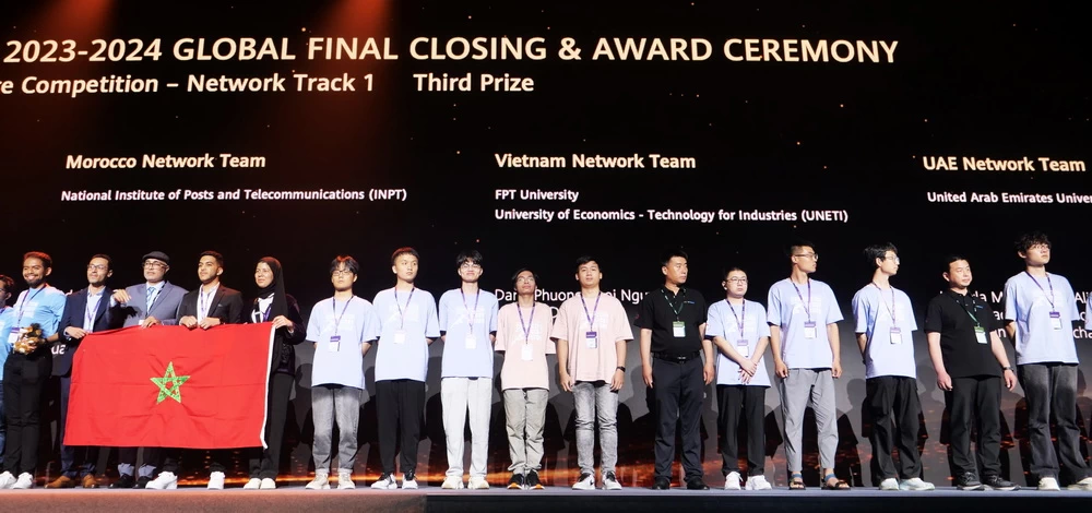 Thành viên Đội Việt Nam (thứ 9 và 10 từ trái sang) nhận giải Ba toàn cầu ở nội dung Network Track tại Cuộc thi Huawei ICT Competition 2023–2024. (Ảnh do Huawei cung cấp).