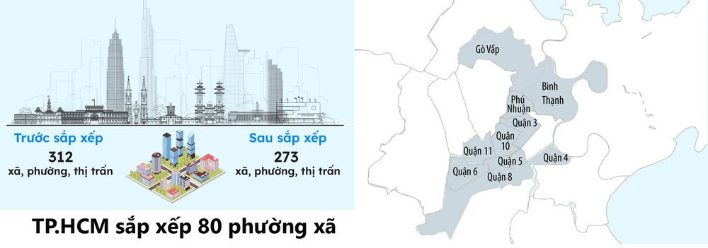 Từ ngày 1-1-2025, các phường mới được sắp xếp tại TP HCM chính thức đi vào hoạt động. 80 phường thuộc 10 quận được sắp xếp theo hình thức sáp nhập thành 41 phường. Như vậy sẽ có 39 phường không còn tồn tại.