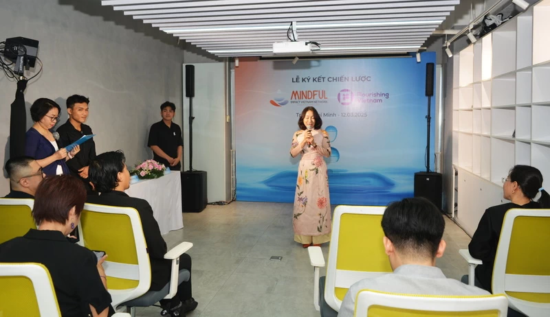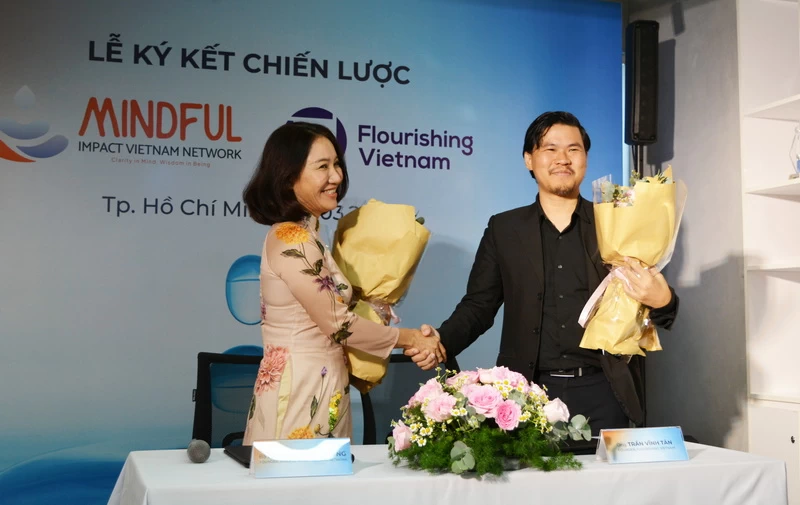 Bà Nguyễn Minh Hương, Nhà sáng lập Mindful Impact Vietnam Network, và ông Trần Vĩnh Tân, Nhà sáng lập Flourishing Vietnam, ký kết hợp tác ngày 12-3-2025 tại TP.HCM.