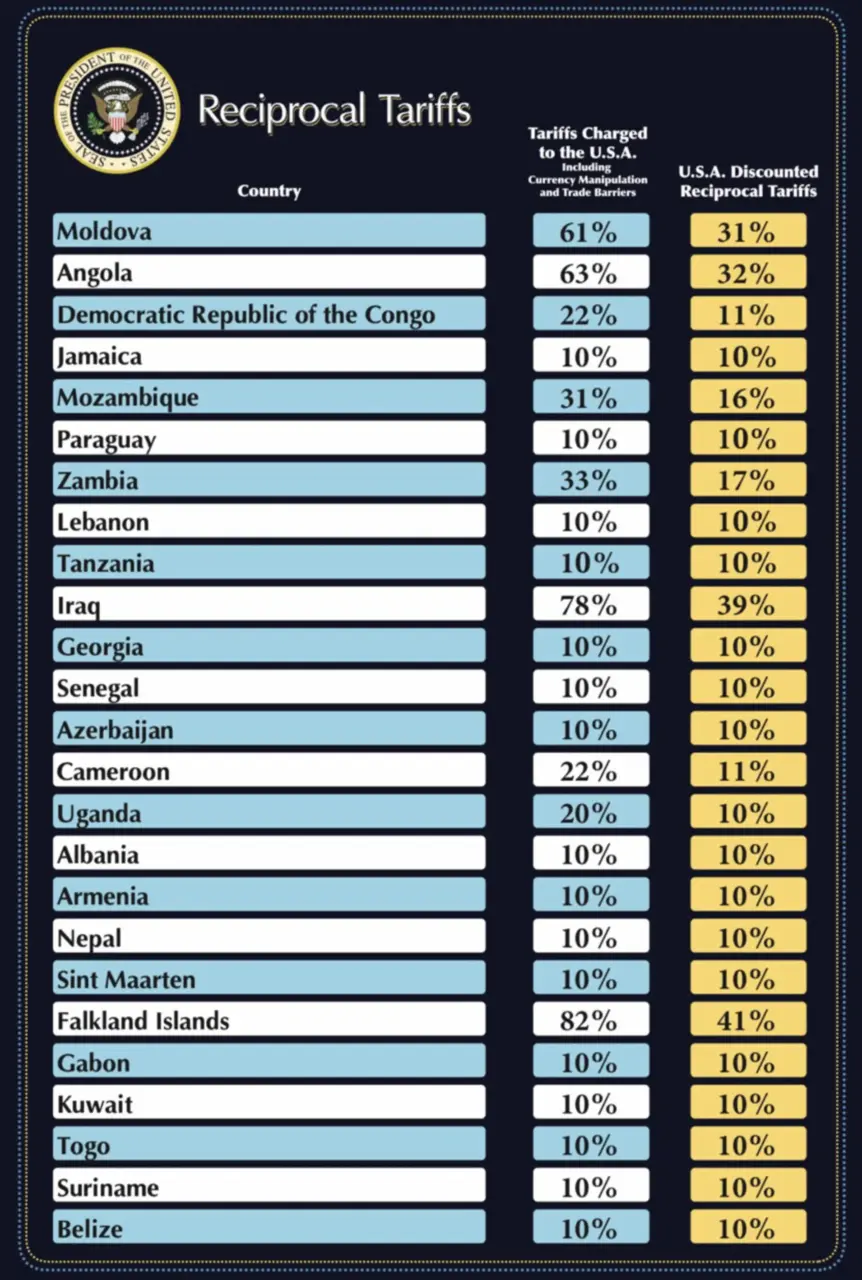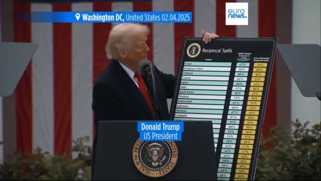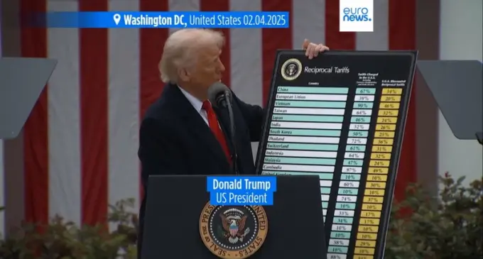 Vào lúc 16g ngày thứ Tư 2-4-2025 theo giờ Washington DC (3g sáng 3-4 theo giờ VN), có lẽ né Ngày Cá Tháng Tư 1-4, tại sân cỏ Rose Garden trong Tòa Bạch ốc (White House), Tổng thống thứ 47 của Hoa Kỳ, ông Donald Trump đã công bố “trận động đất thuế quan toàn cầu” với các mức thuế quan mới được áp dụng đối với hơn 180 quốc gia và vùng lãnh thổ, bao gồm các nước thuộc Liên minh Châu Âu (EU). Tại sự kiện này, ông đã ký sắc lệnh (Executive Order) “Điều chỉnh Nhập khẩu bằng Thuế quan đối ứng để sửa chữa các thực hành thương mại góp phần vào thâm hụt thương mại hàng hóa hàng năm lớn và liên tục của Hoa Kỳ” (Regulating Imports with a Reciprocal Tariff to Rectify Trade Practices that Contribute to Large and Persistent Annual United States Goods Trade Deficits) áp chính sách thuế mới lên hàng nhập khẩu vào Mỹ.