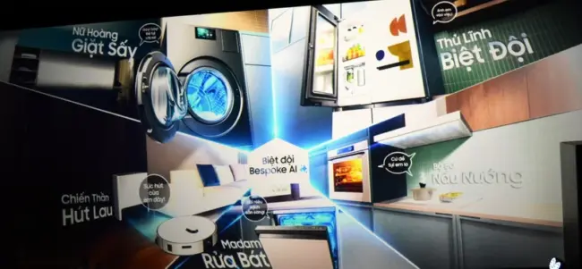 - Trong phòng giặt, Samsung mang lại trải nghiệm mới với máy giặt sấy bơm nhiệt Bespoke AI Laundry Combo, tích hợp công nghệ giặt AI Wash và sấy bơm nhiệt AI Heatpump. AI tự động nhận diện độ bẩn và chất liệu vải để điều chỉnh chu trình giặt – sấy tối ưu. Không chỉ giúp chăm sóc áo quần tốt hơn, thiết bị còn tiết kiệm đến 75% năng lượng và rút ngắn thời gian giặt sấy đến 60%. Đặc biệt, người dùng chỉ cần đổ nước giặt một lần, đủ dùng cho hơn 32 lần giặt, giúp giảm thao tác thủ công và tối đa hóa sự tiện lợi.