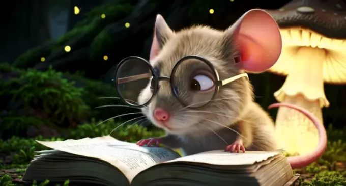 Thành phẩm từ câu lệnh: Cảnh hoạt hình một chú chuột bé xíu đeo cặp kính ngoại cỡ, đang đọc sách dưới ánh sáng lung linh từ cây nấm, trong một cái ổ ấm cúng giữa khu rừng