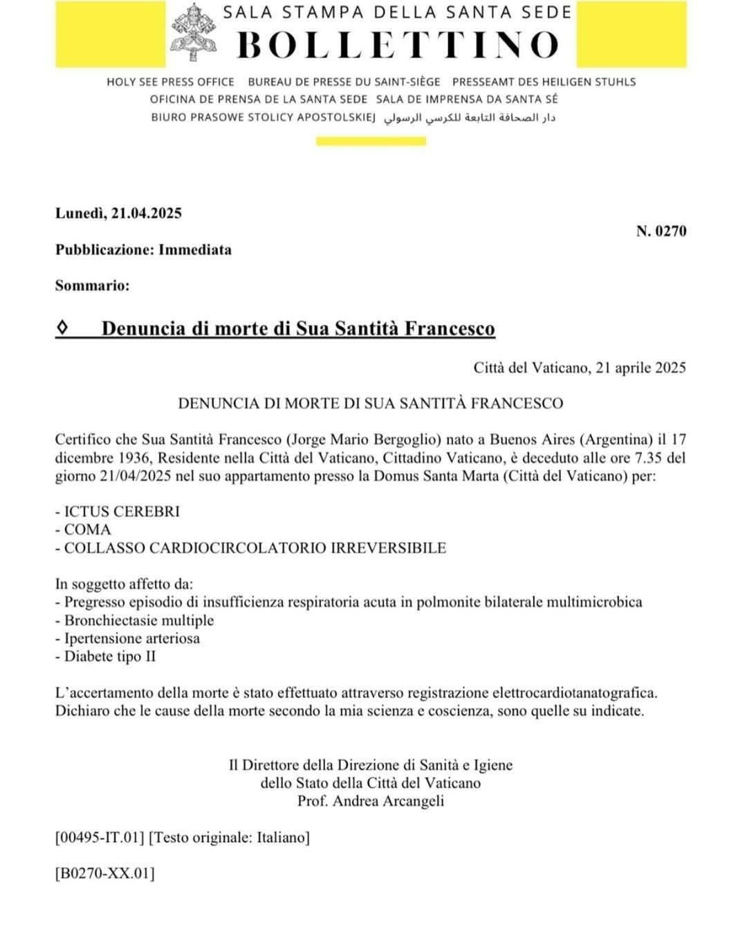 Trong thông báo y tế được Phòng Báo chí Tòa Thánh công bố chiều tối thứ Hai 21-4-2025 (được Vatican News đưa tin), ông Andrea Arcangeli, Giám đốc Sở Y tế và Vệ sinh thuộc Phủ Thống đốc Vatican (Director of the Directorate of Health and Hygiene of the Vatican City State), xác nhận ba nguyên nhân trực tiếp dẫn đến sự qua đời của Đức Thánh Cha là do đột quỵ não, hôn mê, suy tim không hồi phục (a stroke, followed by a coma and irreversible cardiocirculatory collapse).