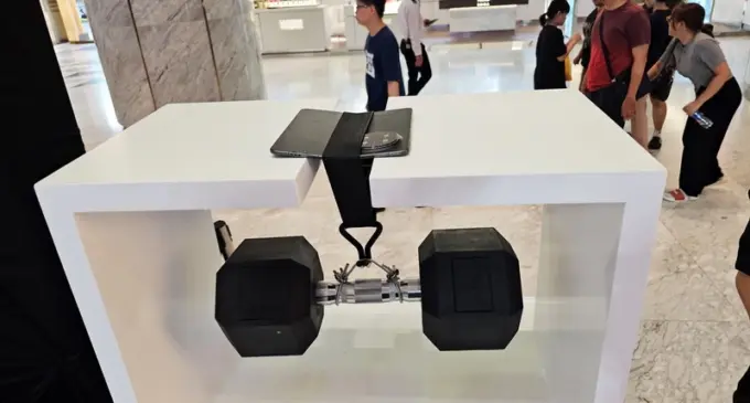 Thử nghiệm độ bền chắc của smartphone gập OPPO Find N5 khi chịu treo 2 quả tạ có tổng trọng lượng 20kg. (Ảnh: PHP).