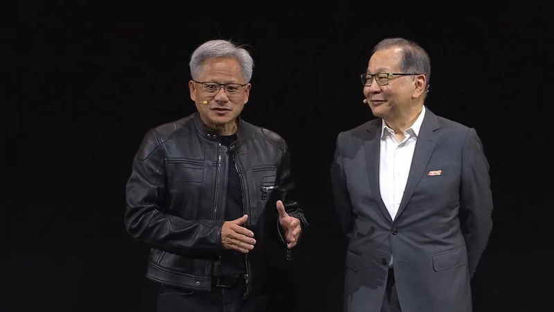 Ông Jensen Huang, nhà sáng lập và CEO của NVIDIA (bên trái), tham gia bài keynote của Tiến sĩ Rick Tsai, Phó Chủ tịch kiêm Giám đốc điều hành của MediaTek, tại COMPUTEX Taipei 2025 ngày 20-5-2025.