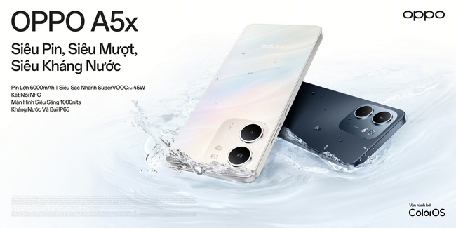 OPPO ngày 21-6-2025 đã ra mắt OPPO A5x, smartphone phân khúc phổ thông có khả năng kháng nước và bụi đạt chuẩn IP65, độ bền chuẩn quân đội, cùng viên pin lớn 6000mAh.