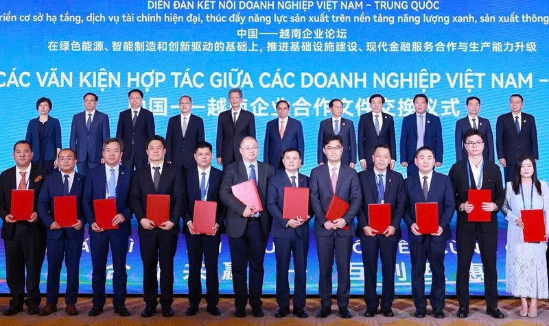 Lễ trao Biên bản ghi nhớ hợp tác giữa các doanh nghiệp Việt Nam – Trung Quốc, dưới sự chứng kiến của Thủ tướng Phạm Minh Chính (đứng thứ 6 từ phải qua, hàng trên).