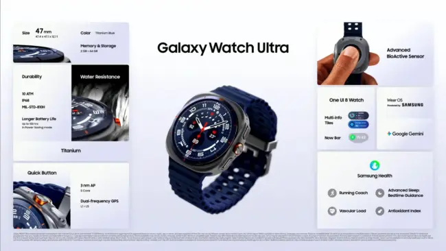 Đối với những người yêu thích hoạt động ngoài trời, Galaxy Watch Ultra (2025) là mẫu Galaxy Watch tiên tiến và bền bỉ nhất từ trước đến nay. Sản phẩm có bốn lựa chọn màu sắc với chất liệu titan, bao gồm màu Xanh Titan mới, sở hữu thời lượng pin dài nhất và hiệu suất mạnh mẽ nhất trong toàn bộ dòng sản phẩm Galaxy Watch. Ở chế độ tiết kiệm năng lượng, thời lượng pin lên tới 100 giờ.