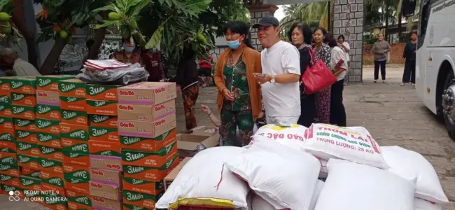 Chị đeo túi xách màu đỏ cùng đoàn từ thiện Phát Minh từ Kiến Tường (thuộc Long An cũ, nay là Tây Ninh) phát quà tại Chùa Hải Sơn (Phú Yên cũ) ngày 1-8-2025.