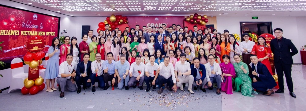 Đội ngũ cán bộ nhân viên Huawei Việt Nam tại buổi khai trương văn phòng mới với cơ sở vật chất và trang thiết bị công nghệ hiện đại.
