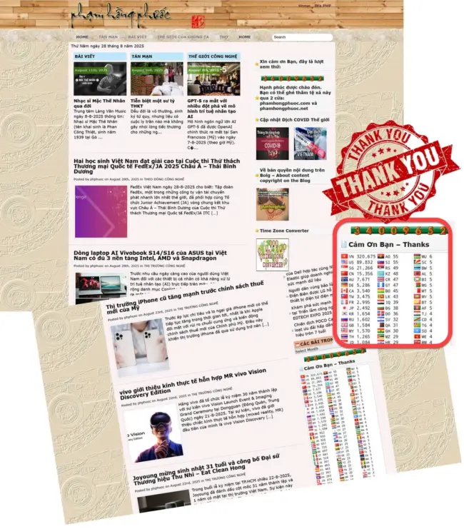 Với những trang web, trang blog “hấp dẫn”, nhất là của những người nổi tiếng KOL, những vạn, những trăm ngàn view,… là chuyện bình thường. Còn với một trang blog “hiền khô” (hiền + khô) như của A Phủ, có thêm được lần bạn đọc quan tâm nào cũng là rất quý. Đặc biệt là A Phủ luôn trân trọng và biết ơn từng lượt đọc của bạn đọc ưu ái dành cho mình. Cần mẫn và trân trọng nhặt từng hạt ngọc, năng nhặt chặt bị. Tệ xá A Phủ từ ngày dựng lên vẫn giữ nguyên nếp nhà là một trang web công nghệ và nhiều chuyện đời khô như ngói, không hề câu view, lại bị “đào hố, đắp mô” cản ngõ, nhưng đã được các bạn đồng điệu và đồng đạo bốn phương tám hướng nước ngoài nước trong ưu ái dành cho nhiều tình cảm. Hic! Ở VN, bạn đọc bằng hữu phải dùng tuyệt chiêu đằng vân VPN để phi thân mới ghé thăm đặng. (Đó là lý do mà vài ba năm qua, A Phủ có thêm cái domain phamhongphuoc.com mà một cậu em ưu ái tặng cho sau khi mua giữ nhiều năm làm của để dành do lòng ưu ái A Phủ từ lâu. Cảm ơn em nhé).