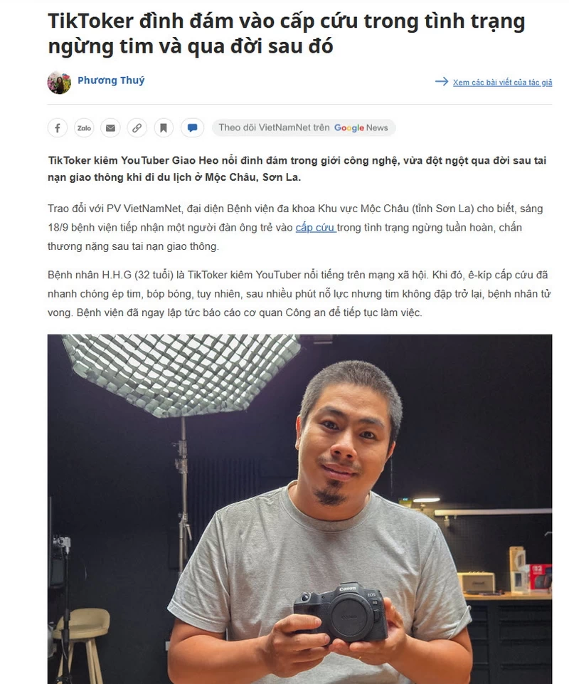 Theo báo VietNamNet, đại diện Bệnh viện đa khoa Khu vực Mộc Châu (tỉnh Sơn La) cho biết, sáng 18-9-2025, bệnh viện tiếp nhận một người đàn ông trẻ vào cấp cứu trong tình trạng ngừng tuần hoàn, chấn thương nặng sau tai nạn giao thông khi đi du lịch ở Mộc Châu. Khi đó, ê-kíp cấp cứu đã nhanh chóng ép tim, bóp bóng, tuy nhiên, sau nhiều phút nỗ lực nhưng tim không đập trở lại, bệnh nhân tử vong. Bệnh viện đã ngay lập tức báo cáo cơ quan Công an để tiếp tục làm việc.