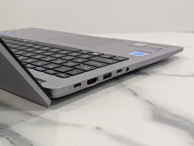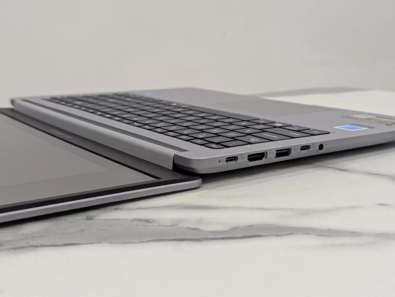 Ngoài ra, bản lề (hinge) của máy được thiết kế đặc biệt, cho phép mở rộng đến 180 độ, mang lại sự linh hoạt tối đa khi thuyết trình hoặc chia sẻ nội dung với đồng nghiệp. Thiết kế này cũng chứng minh độ chắc chắn, bền bỉ của bản lề – một chi tiết nhỏ nhưng khẳng định chất lượng tổng thể của sản phẩm.
