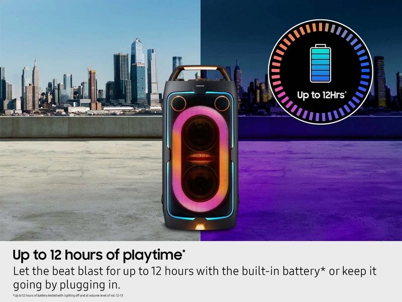 Dù ở trong nhà hay ngoài trời, người dùng vẫn có thể tận hưởng âm nhạc bền bỉ với thời lượng pin lên tới 18 giờ chỉ với một lần sạc. Pin có thể thay thế bảo đảm cuộc vui không bị gián đoạn, trong khi khả năng kháng tia nước IPX4 giúp an tâm khi sử dụng ngoài trời. Để mở rộng không gian âm thanh, người dùng có thể kết nối nhiều loa với nhau qua Auracast Group Play hoặc ghép đôi hai loa tháp di động bằng Stereo Play với True Wireless Stereo (TWS) để có âm thanh kênh trái và phải chân thực.