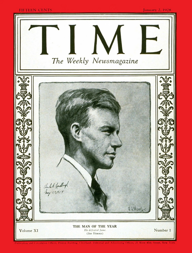 Bìa của TIME trong lần lựa chọn Nhân vật của năm đầu tiên năm 1927. Nhân vật đó là Charles Augustus Lindbergh, nhà phi hành Mỹ đã thực hiện chuyến bay một mình không dừng nghỉ đầu tiên vượt Đại Tây Dương từ New York (Mỹ) tới Paris (Pháp) ngày 20 và 21-5-1927. Khoảng cách 3.600 mile (5.800km). Ông đã bay một mình trong 33 giờ trên chiếc máy bay 1 động cơ, 1 chỗ ngồi Spirit of St. Louis.