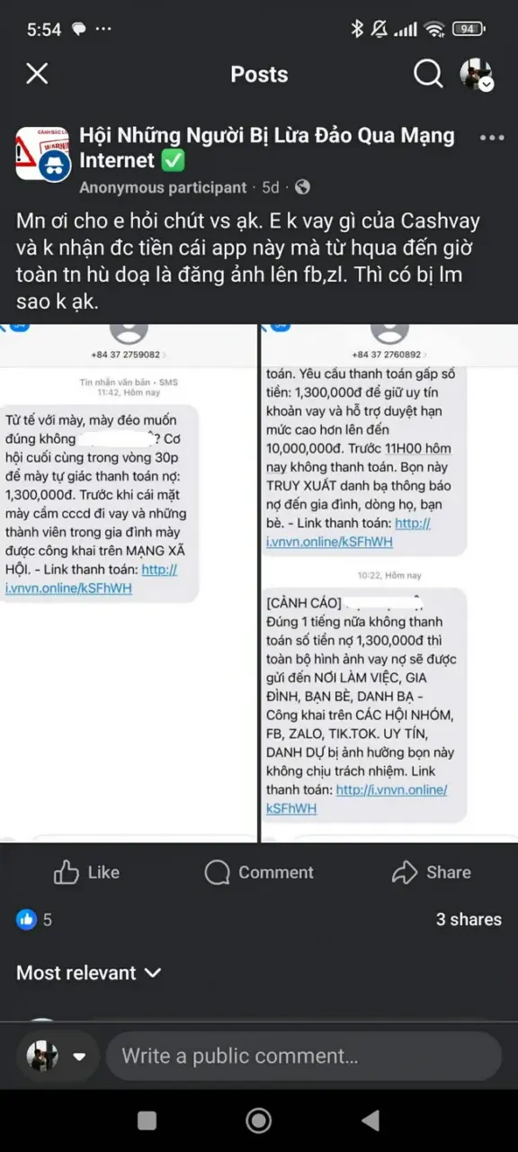 A Phủ nhận tin nhắn SMS từ số +84399069310, tuy là gởi vào số phone của A Phủ nhưng có nội dung “đòi nợ” con trai A Phủ. Món nợ “CashVay_1,300,000”. Lời lẽ của kẻ xưng là “App” rất là “mất dạy”. Nó kèm tới 2 link để nhấn vô mà “thanh toán”.