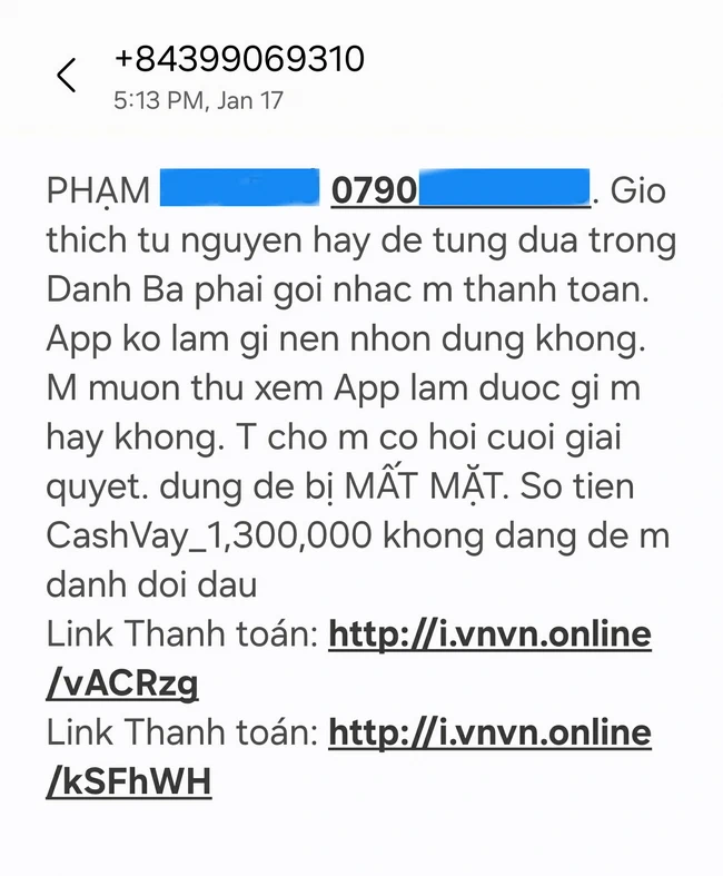 A Phủ nhận tin nhắn SMS từ số +84399069310, tuy là gởi vào số phone của A Phủ nhưng có nội dung “đòi nợ” con trai A Phủ. Món nợ “CashVay_1,300,000”. Lời lẽ của kẻ xưng là “App” rất là “mất dạy”. Nó kèm tới 2 link để nhấn vô mà “thanh toán”.