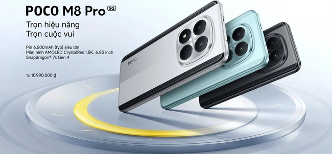 - POCO M8 Pro 5G có giá bán chính thức là 10.990.000 đồng (phiên bản RAM 8GB + ROM 256GB) và 12.490.000 đồng (phiên bản RAM 12GB + ROM 512GB).