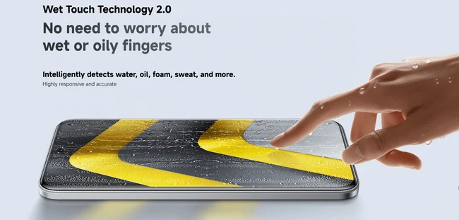 POCO M8 5G được trang bị màn hình đục lỗ bo cong đôi (dual-curved) AMOLED 6.77 inch độ phân giải FHD+ (1080 x 2392 pixel), hỗ trợ 68 tỷ màu, với tần số quét 120Hz và độ sáng tối đa 3.200 nit, mang lại trải nghiệm hình ảnh mượt mà và rõ nét khi xem phim, chơi game hay lướt mạng xã hội hằng ngày. Tương tự phiên bản Pro, màn hình của POCO M8 5G cũng đạt bộ ba chứng nhận bảo vệ mắt của TÜV Rheinland, bao gồm giảm ánh sáng xanh, chống nhấp nháy và thân thiện với nhịp sinh học (TÜV Rheinland’s Circadian Friendly Certified, TÜV Rheinland’s Low Blue Light – Hardware Solution Certified, TÜV Rheinland’s Flicker Free Certified), giúp mang lại trải nghiệm sử dụng thoải mái và an toàn. Công nghệ chạm khi ướt Wet Touch Technology 2.0 cho phép thao tác trên màn hình khi có nước, dầu, mồ hôi, bọt xà bông,…