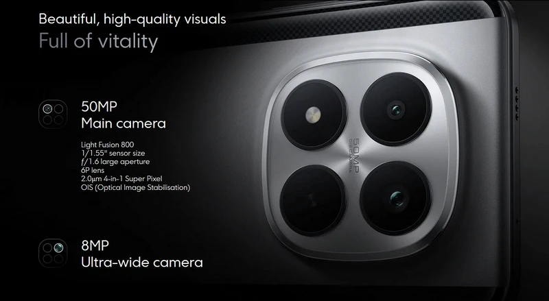 Thiết bị sở hữu camera chính 50MP với cảm biến Light Fusion 800, 1/1.55″, 2.0μm 4-in-1 Super Pixel, f/1.6, 6P lens, chống rung OIS, tính năng quay video 4K, cùng camera góc rộng 8MP và camera trước 32MP. Ngoài ra, POCO M8 Pro 5G hỗ trợ nhiều thuật toán AI chỉnh sửa ảnh, giúp mang lại trải nghiệm chụp ảnh sống động.