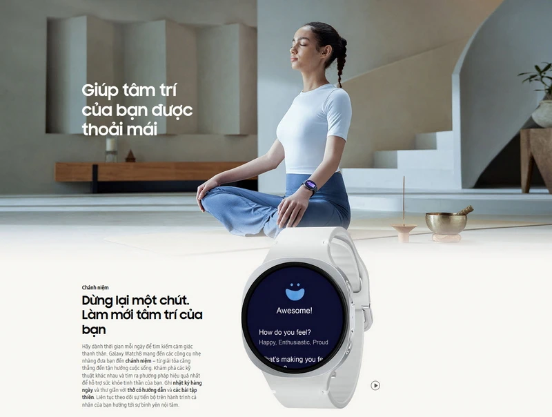 Hệ sinh thái thiết bị tích hợp AI của Samsung mang đến trải nghiệm chăm sóc sức khoẻ và nâng tầm không gian sống liền mạch và dễ dàng – từ luyện tập thể chất, nâng cao dinh dưỡng, tối ưu môi trường sống, đến chăm sóc các thành viên trong gia đình. Người dùng có thể sử dụng các thiết bị đeo Galaxy để theo dõi các chỉ số sức khoẻ và nhận được gợi ý hành động trên ứng dụng Samsung Health khi kết nối với điện thoại Galaxy, khiến việc chăm sóc sức khỏe trở nên toàn diện và tự nhiên hơn mỗi ngày.