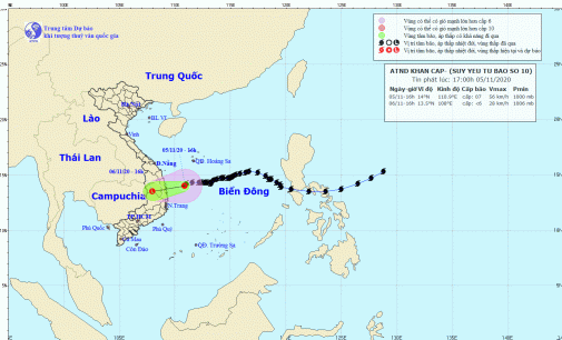 Tin của Trung tâm Dự báo Khí tượng Thủy văn Quốc gia phát lúc 17g ngày 5-11-2020. Chiều nay (05/11), bão số 10 (tên quốc tế Goni) đã suy yếu