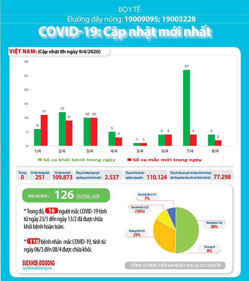 Bản tin dịch COVID-19 trong 24h qua của Bộ Y tế (cập nhật 9g ngày 9-4-2020): Hơn 50% người mắc bệnh COVID-19 ở Việt Nam đã khỏi bệnh Suckhoedoisong.vn