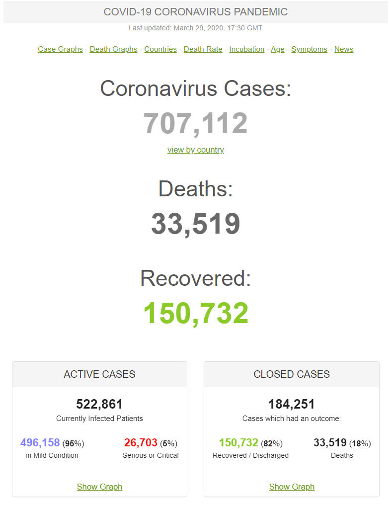 Cập nhật vào lúc 17:30 GMT ngày 29-3-2020 (0:30 ngày 30-3-2020 VNT), trang Worldometer ghi nhận thế giới có 707.112 ca nhiễm novel coronavirus; 33.519 người chết vì