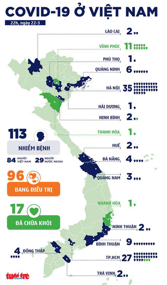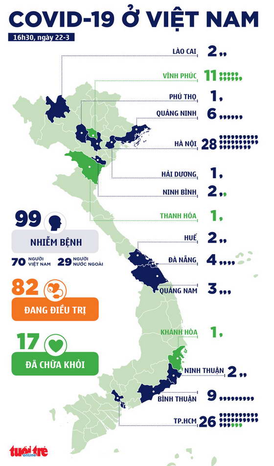 Sau đợt công bố đầu tiên lúc 17g ngày 22-3 với 4 ca mới (từ BN96 tới BN99), Bộ Y tế lúc 21g45 đã công bố thêm 14 ca