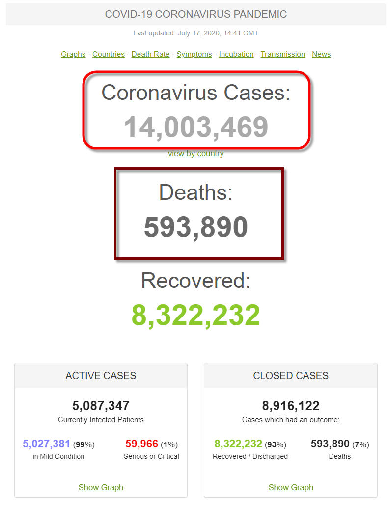 Sáng nay, 21-7-2020, Worldometer cập nhật tổng số người bệnh COVID-19 trên thế giới đã là 14.845.017 người và