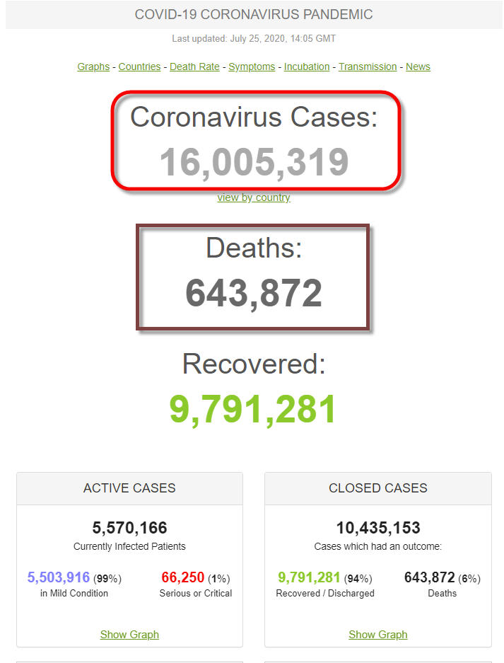 Thần tốc! Thần tốc! Kinh khủng khiếp! Sáng 25-7-2020, trang Worldometer báo rắng thế giới đã có 15.940.381 người